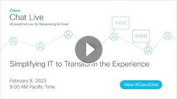 IT complexity is on the rise with hybrid work, IoT, cloud, and security threats, but users expect unified experiences that operate flawlessly no matter where they are. IT requires simple solutions that span technology domains to help orchestrate across the supply chain from the user to the application. Join us for this live #CiscoChat from Cisco Live Amsterdam on February 8th at 9 AM PT for a discussion on how deploying our solutions can transform your organization's infrastructure by simplifying IT and driving productivity, revenue, and growth.