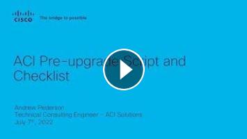 This video demonstrates how to prepare your ACI fabric for an upgrade, it specifically demonstrates the ACI upgrade script which automates the pre-upgrade checklist. ACI Pre-upgrade checklist landing page : https://www.cisco.com/c/en/us/td/docs/dcn/aci/apic/all/apic-installation-aci-upgrade-downgrade/Cisco-APIC-Installation-ACI-Upgrade-Downgrade-Guide/m-pre-upgrade-checklists.html