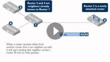 In this animation, we see how, within the exchange of 3 packets, two newly connected routers can reach a two-way neighbour relationship. The key is that OSPF hello packets contain a list of the Router IDs of neighbors that the sending router has recently received valid Hellos from. So, each router can see itself the other router's list of neighbours.